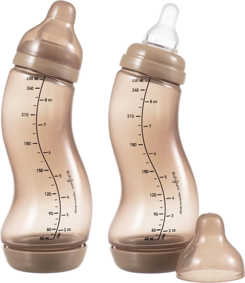 De lichtbruine 250 ml Difrax S-fles heeft een unieke S-vorm die zorgt voor een constante stroom van voeding. Het speciale ventiel in de bodem zorgt ervoor dat lucht niet mengt met de voeding, hierdoor blijven alle voedingsstoffen behouden.