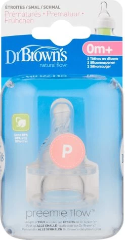Speciaal voor premature baby’s. Ook geschikt voor baby’s die anderszins moeite hebben met drinken (bijvoorbeeld door een verminderd zuigreflex). De prematuurspeen heeft een extra klein gaatje, waardoor de voeding nooit te snel doorstroomt. Spenen van Dr. Brown’s zijn gemaakt van klinisch geteste siliconen. Door de zeer zachte textuur en speciale vorm liggen ze perfect in je baby’s mond. Vervang spenen elke zes weken, of eerder als ze tekenen van slijtage vertonen.