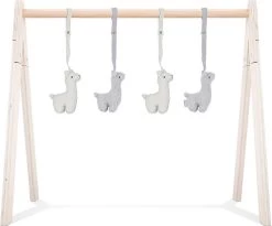 Deze vier speelfiguurtjes zijn geschikt voor gebruik in combinatie met de Jollein houten babygym. Het is van zachte teddystof in roze, nougat of groen. Vanaf ongeveer 10 weken krijgt je baby steeds meer behoefte aan prikkels, spelen en rondkijken. Dat is het moment dat een babygym die extra uitdaging biedt. Haal gauw de houten babygym in huis en versier deze met deze leuke figuurtjes in de vorm van twee maantjes en twee sterren. Leg je baby er onder op een zachte ondergrond en het spelen kan beginnen! De bewegingen van de speeltjes aan de babygym vindt je baby fascinerend om te zien. Hij zal enthousiast met zijn voetjes trappelen of geluidjes gaan maken als hij een speeltje weet te grijpen of aan te tikken zodat het nog meer gaat bewegen. Het gebruik van de babygym stimuleert de ontwikkeling van de grove en fijne motoriek. Het prikkelt de zintuigen. Bovendien krijgt je baby steeds meer controle over zijn grijptechnieken en het leert dat speeltjes meer gaan bewegen als je er tegen aan tikt of speeltjes vastgrijpt. Heel waardevol dus, zo’n babygym. De babygymspeeltjes van Jollein worden exclusief de houten babygym geleverd. De babygym is los verkrijgbaar en gemakkelijk in elkaar te zetten. In de Jollein collectie zijn meerdere bijpassende babygymspeeltjes verkrijgbaar. Je kunt de babyspeeltjes makkelijk bevestigen en weer verwijderen. Daardoor kun je afwisselen met de speeltjes en blijft het voor je baby interessant en uitdagend.