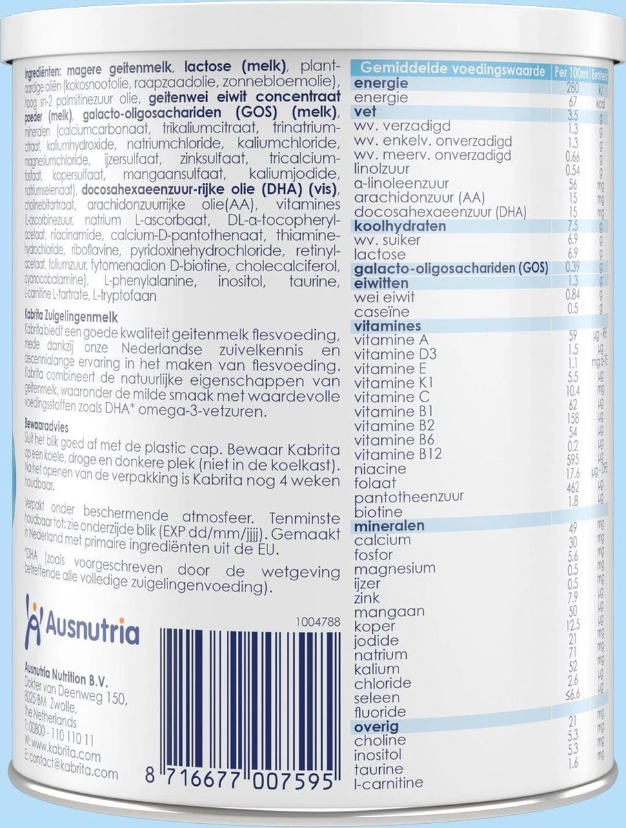 Borstvoeding is de beste voeding voor je baby. Lukt het niet (meer) om borstvoeding te geven of wil je het (deels) afbouwen, dan kan Kabrita Zuigelingenmelk (0-6 maanden) worden gebruikt vanaf de geboorte. Kabrita 1 Zuigelingenmelk wordt gemaakt van geitenmelk van hoge kwaliteit.