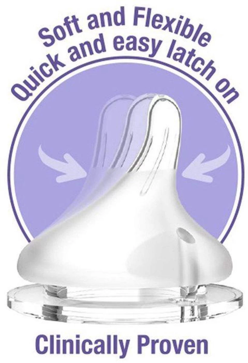 De Lansinoh Natural Wave Teats x 2 – Slow Flow bevat twee superzachte en flexibele 100% siliconen spenen met snelle stroming. De Lansinoh spenen zijn ontworpen om gemakkelijk aan te klikken en effectief te zuigen, wat de golfachtige tongbeweging van de baby stimuleert en instinctieve zuigwerking bevordert voor een natuurlijke orale ontwikkeling. Het AVSTM-luchtventilatiesysteem vermindert de inname van lucht, wat een mogelijke oorzaak is van koliek waardoor uw baby comfortabel kan eten. Van deze Lansinoh-spenen is klinisch bewezen dat ze helpen de gevestigde borstvoedingspatronen te behouden
