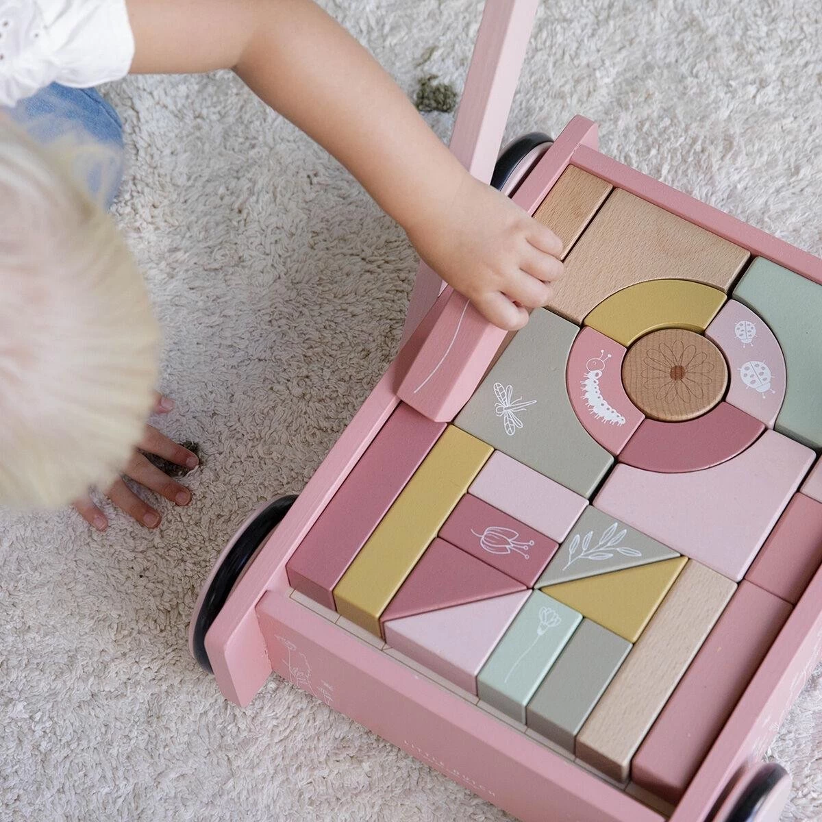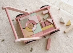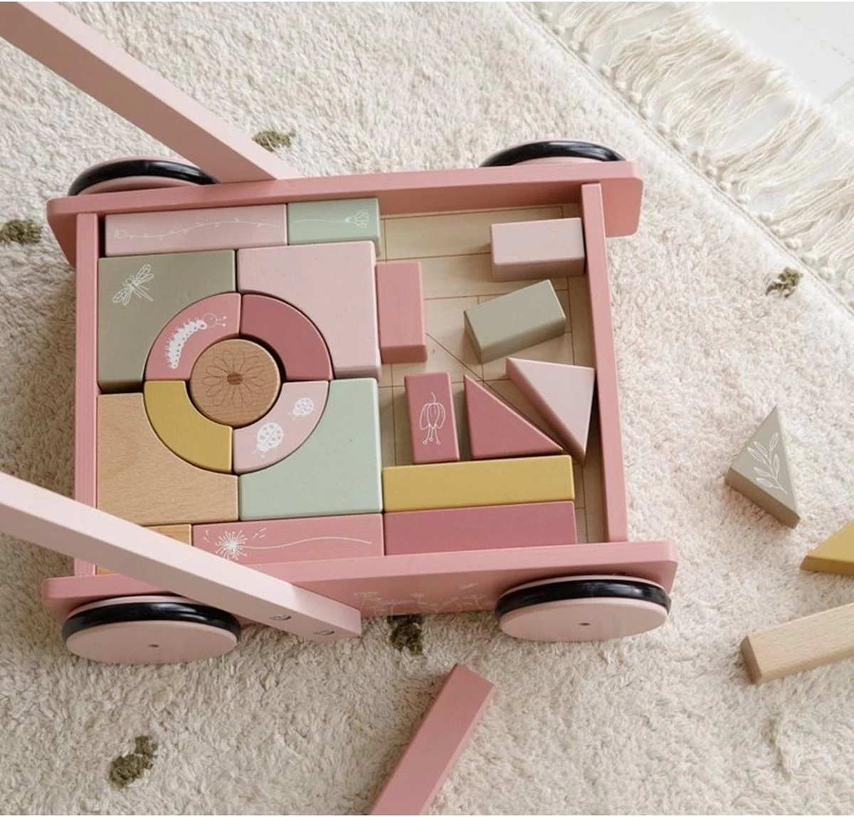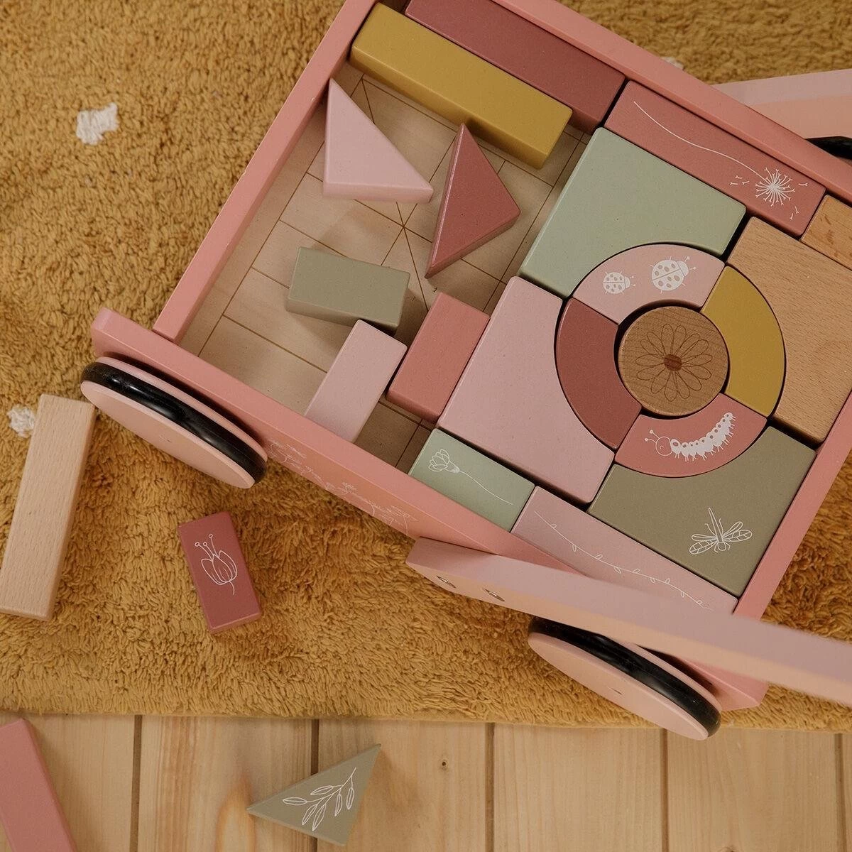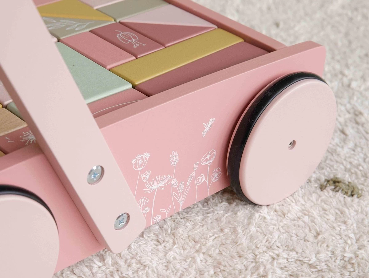 De bloktrolley is voorzien van houten wieltjes en gevuld met gekleurde houten blokken met daarop prachtige tekeningen van bloemen en insecten uit de Wild Flowers collectie. De verschillende maten van de blokken bevorderen de herkenning van kleuren en vormen door kinderen. Het handvat zit op de juiste hoogte voor peuters zodat ze fijn door de kamer kunnen stappen. Deze vrolijke kar vol blokken staat garant voor urenlang bouwplezier.