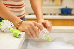 Wie zegt dat flessenborstels gewoon moeten zijn? We veranderden dit volledig met een borstel die rechtop staat en een sterke zuigbasis heeft. Het unieke gestructureerde rubber bereikt moeilijk te reinigen oppervlakken waar ziektekiemen zich graag verstoppen. Binnenin de handgreep zit onze speenborstel, zodat u die ook steeds bij de hand hebt. Gewoon vastzuigen op het werkblad voor reiniging met een hand en drogen zonder kiemen. Hij staat als een huis!