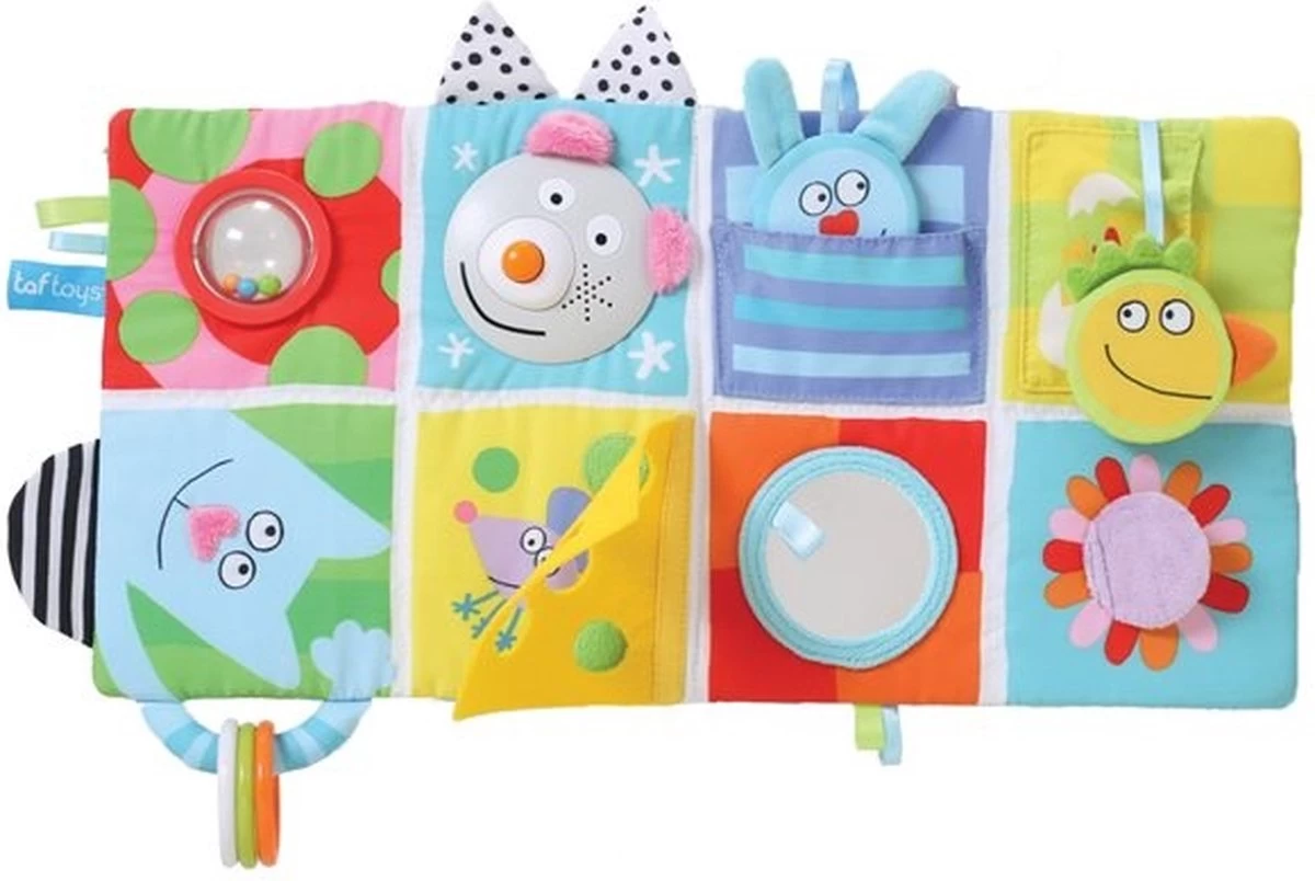 Dit vrolijke activiteitencentrum is geschikt voor de box. Het activiteitencentrum is op verschillende manieren te gebruiken. Afhankelijk van de leeftijd van je kindje. gemaakt van katoen. Wat een welkome aanvulling is in de levensfase waar het ontdekken een steeds belangrijkere rol speelt, ook in de zithouding. Het speelboek kan gemakkelijk worden meegenomen. Het activiteitencentrum heeft verschillende speelmogelijkheden: vrolijke afbeeldingen, verschillende hangende figuren, ratelgeluiden, kiekeboe spelletjes, plastic ringen, knisper geluidjes en een spiegel en een muis. Ook ideaal voor het oefenen van buikligging. Het activiteiten centrum is te bevestigen dmv de twee meegeleverde clips. Het geluid en licht van de muis werkt op 6x aaa batterijen, deze worden niet meegeleverd.