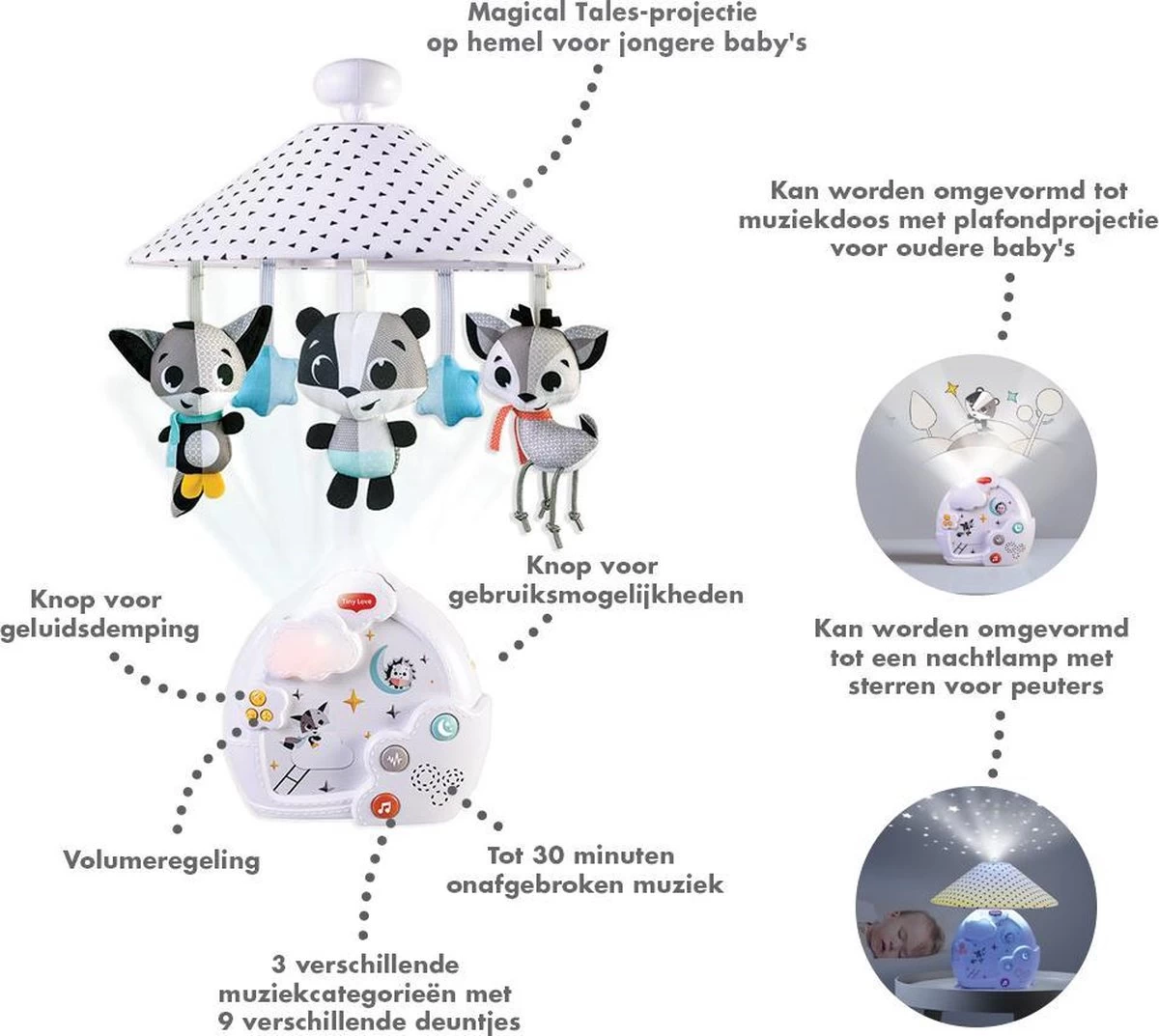 De Magical Night 3-in1 mobiel en projector is gevuld met inspirerende en lieve personages welke je kindje stimuleren en inspireren om te ontwikkelen in een positieve omgeving.