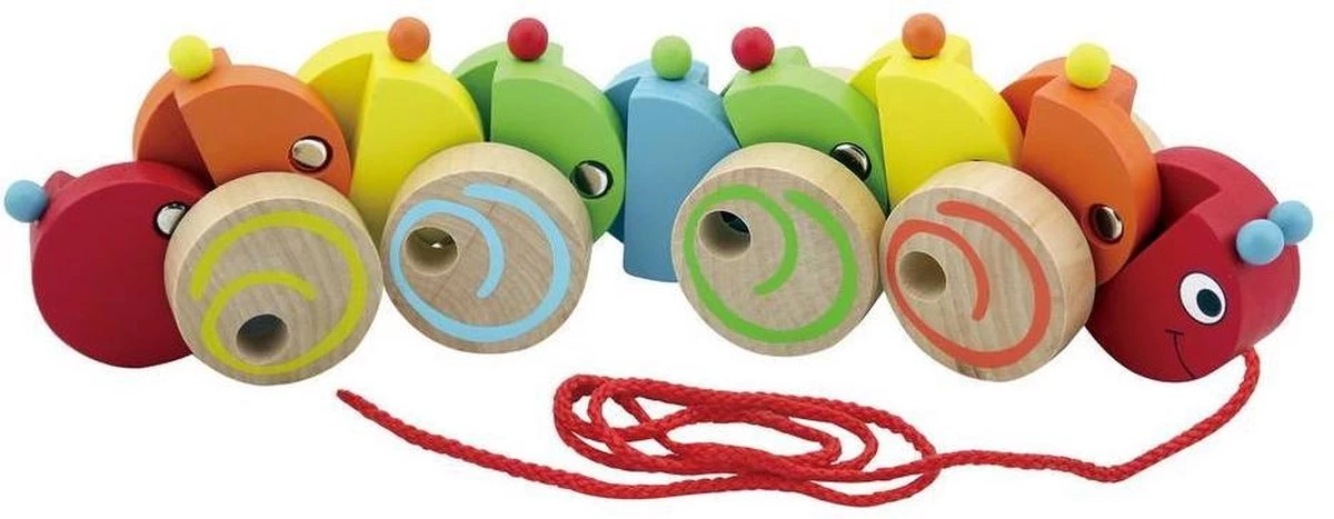 Trek zachtjes aan het koordje van deze vrolijk gekleurde rups en ga fijn een wandeling maken. Kleine voetjes komen in beweging om de vrolijke rups rond te zien draaien. Het koord is 70 centimeter. De aanbevolen leeftijd is 18 maanden en ouder.